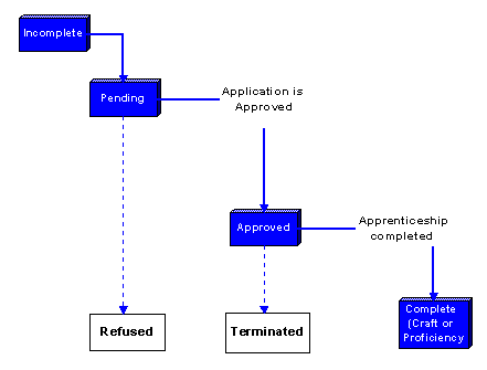 This diagram demonstrates the sequence of status changes for a typical indentured apprenticeship, indentured traineeship or federal apprenticeship.